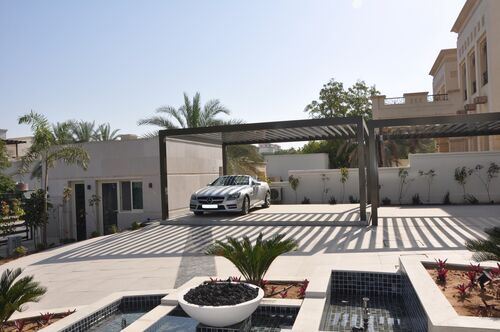 Parkraum unter der Erde mit zusätzlichem Sonnenschutz von oben ist in Dubai City eine gute Idee. Von April bis September wird es dort regelmäßig über 40 Grad heiß. Bei diesem Bauprojekt wurden bauseitige Carports im rechten Winkel direkt neben dem Eingangsportal der Villa platziert. So gelangen die Bewohner nicht nur mit wenigen Schritten ins Haus, die Carports profitieren auch mehrere Stunden am Tag vom Schattenwurf des Gebäudes. Die Pfosten der Carports sitzen auf den Deckelplatten von zwei nebeneinander platzierten WÖHR Parkliften 461-2,6 D. Somit finden bis zu acht Fahrzeuge in dem kleinen Hof Platz. Um die zusätzliche Traglast der Carports sicher zu stemmen, wählte man die Parklift-Variante mit 2.600 kg maximaler Plattformbelastung.