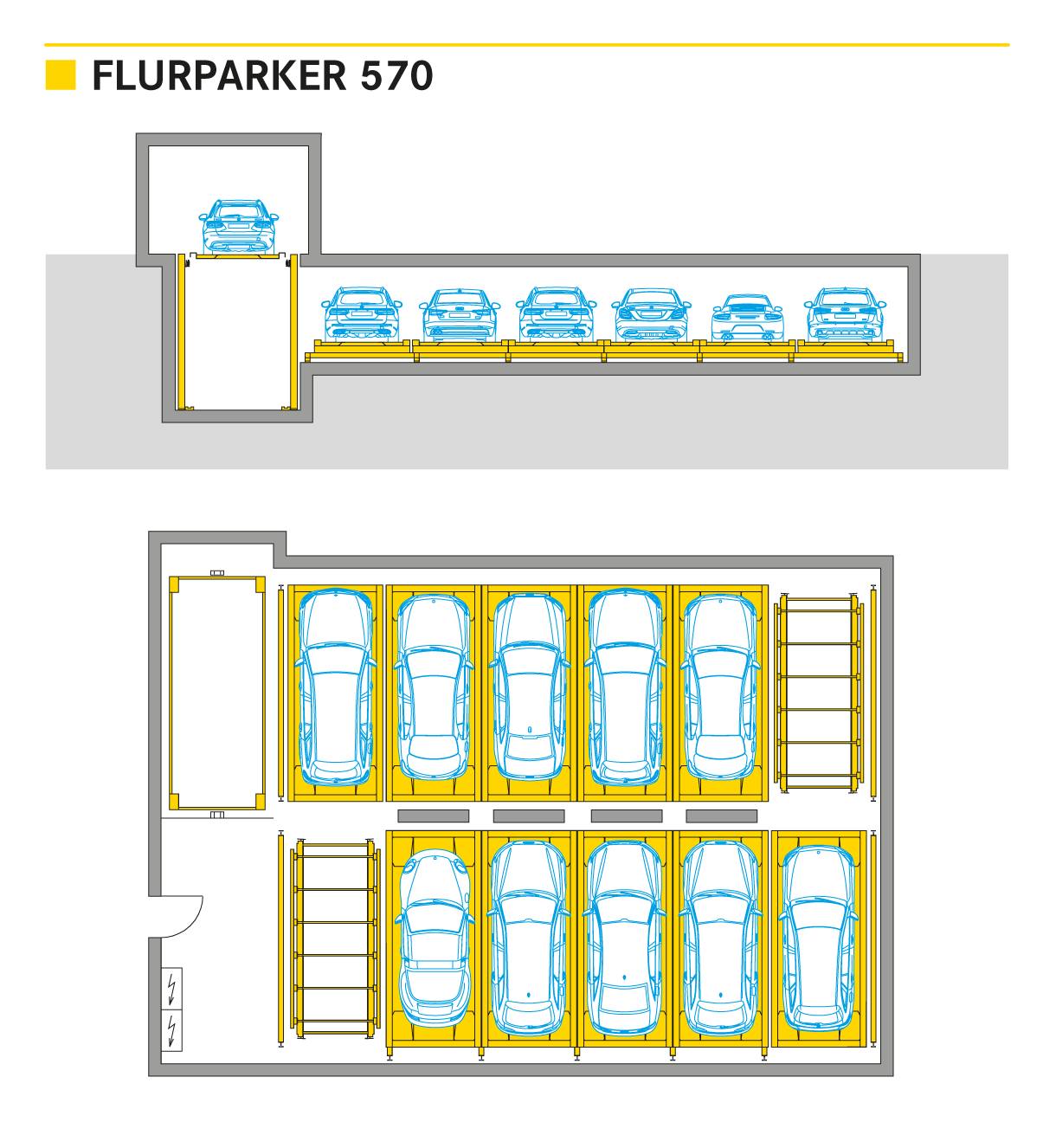 Das vollautomatische Auto-Parksystem Flurparker 570 bietet Parkplätze für 10 - 50 Autos auf bis zu 5 Parkebenen und 2 bis 6 Parkreihen hintereinander. Anstatt einer Rampe kommt ein Vertikalförderer zum Einsatz, die Autos werden beim Ein- oder Ausparkvorgang in Längs- und Querverschiebung bewegt. Der Flurparker 570 passt sich so ganz individuellen Anforderungen an. Eine Drehvorrichtung ist möglich, um die Autos in Vorwärtsrichtung zum Ausparken bereit zu stellen.