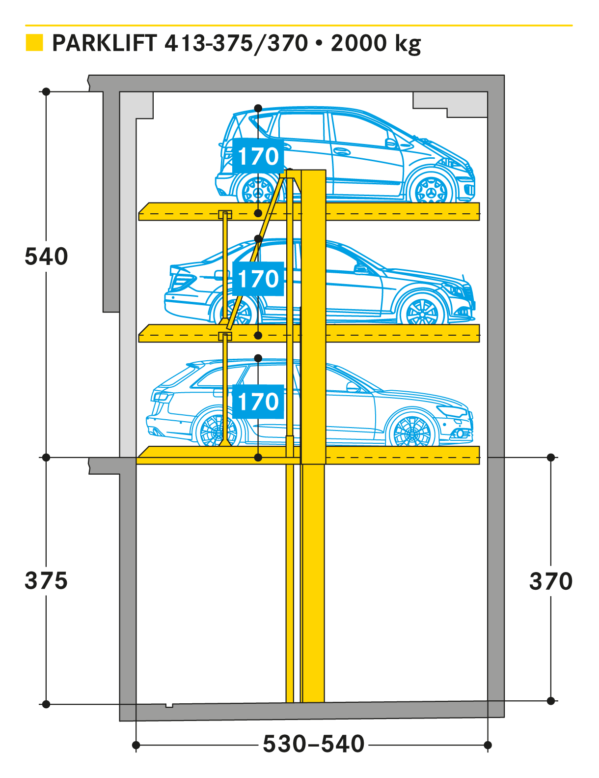 Auf der Grundfläche von etwas mehr als einem Stellplatz können drei Autos übereinander geparkt werden. Das Auto-Parksystem Parklift 413 bietet deshalb eine besonders kostengünstige Lösung bei nur einer Fahrebene und drei Parkebenen. Alle Stellplätze sind waagrecht befahrbar.