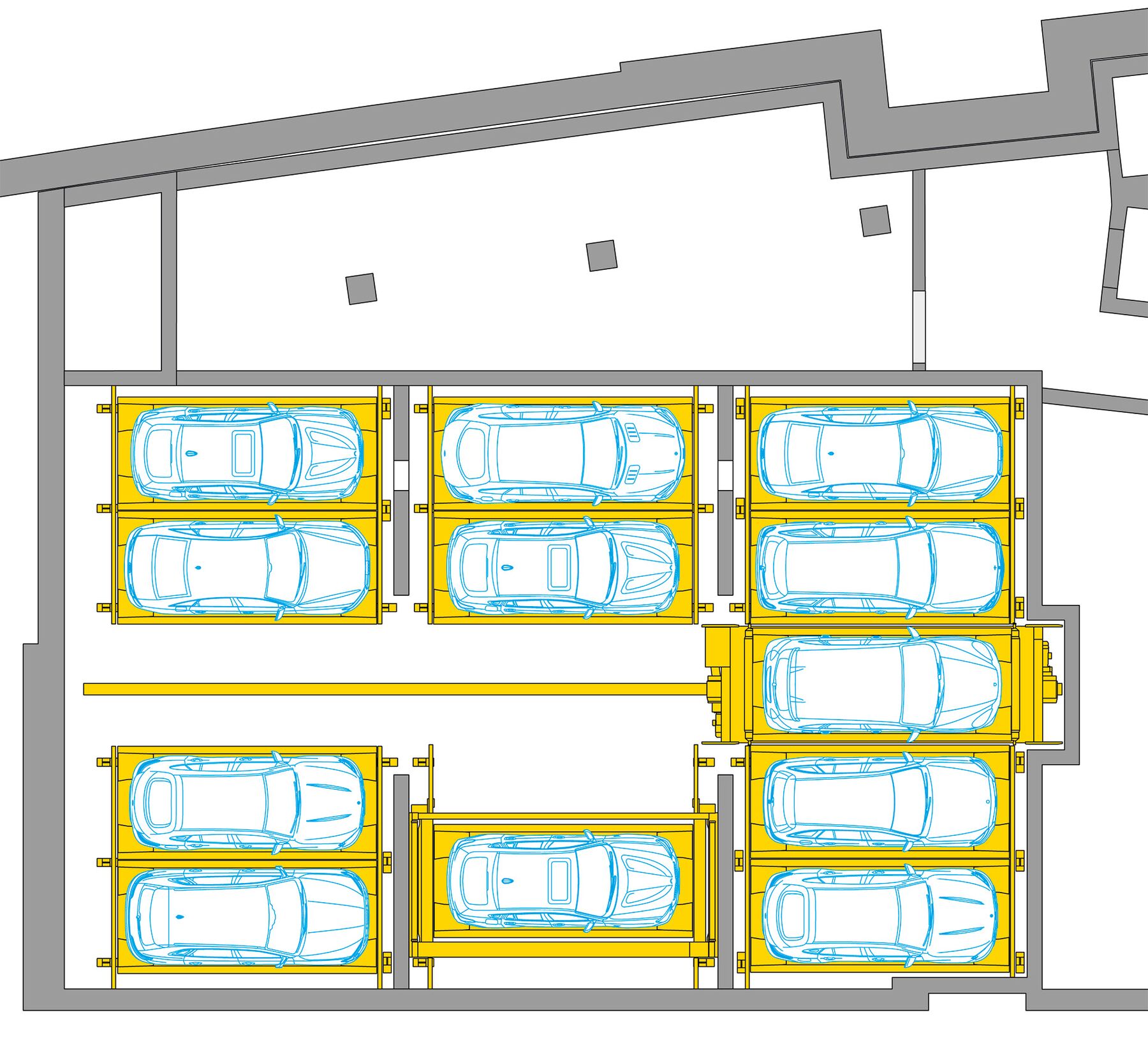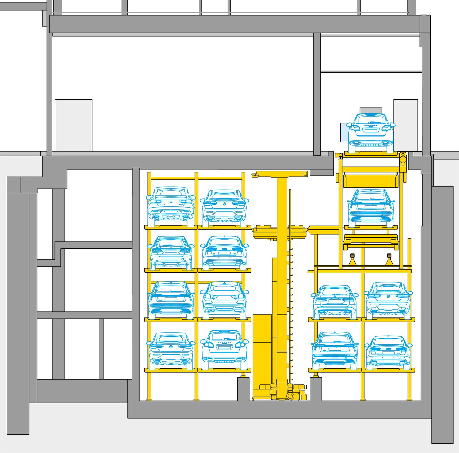 Weiter übernimmt der Franklinturm wesentliche Aufgaben des öffentlichen Raums. Neben der Rampe zur öffentlichen Velogarage findet auch die Be- und Entlieferung der ShopVille des Bahnhofs im Erdgeschoss des Turms statt. Das daran angrenzende Parksystem „WÖHR Multiparker 740“integriert auf effiziente Weise 38 PKW-Stellplätze für die Mietparteien im Gebäude. Nach dem Abstellen der Fahrzeuge in der Übergabekabine werden diese innerhalb von ca. 139 bis 222 Sekunden automatisch verräumt und im vierstöckigen Hochregallager in den Untergeschossen geparkt, je nach Fahrzeughöhe stehen 21 Stellplätze bis max. 2,00 m und 17 Stellplätze bis 1,70 m für Fahrzeuggewichte bis max. 3,00 t zur Verfügung. Die 360°-Drehvorrichtung in der Übergabekabine ermöglicht ein bequemes Ein- und Ausparken jeweils in Fahrtrichtung.
