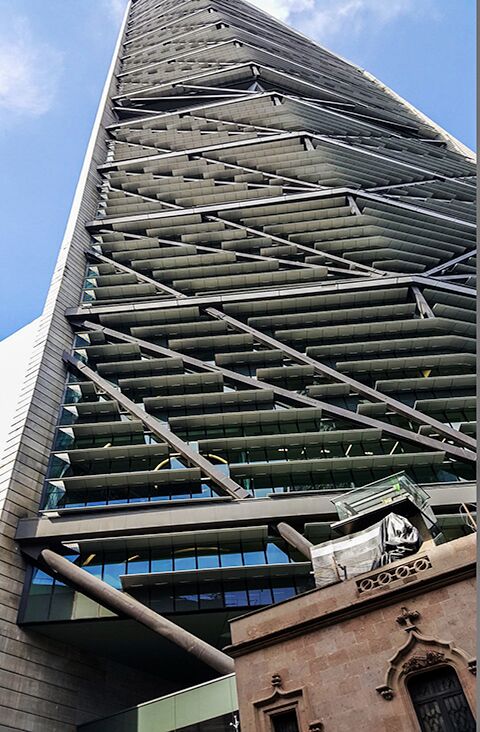 The new building rises into the sky of Mexico-City like a gigantic obelisk - to some, the currently most innovative skyscraper in the world resembles a massive, opened book or, with its two pyramid-shaped concrete facades, is reminiscent of the construction method used by the Aztecs. Two of its three sides show few narrow places where light comes through, only one side opens out and allows daylight into the interior. Aluminium screens in front of the glass facade reduce the direct exposure to sunlight, so that the energy-efficiently designed building heats up less. The architects attached great importance on a sustainable, resource-saving design - in particular regarding the materials and the intelligent building technology.