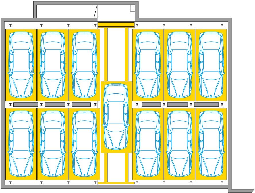 The Conseil d'Etat and Clinique St. Joseph buildings, located in the heart of Luxembourg's old town, were converted and renovated under strict adherence to architectural and historical requirements. The automatic parking system is entered at sublevel 2 via a car lift. This system features 2 rows of parking spots located behind each other on the right and left sides of the vertical conveyor, which has a long shaft to reach the top of the facility. A shuttle rests on the conveyor and moves the cars to both bays. To maximize the restricted space available, 3 parking places are arranged next to each other per bay and level. The conveyor system and software park the cars safely and reliably.