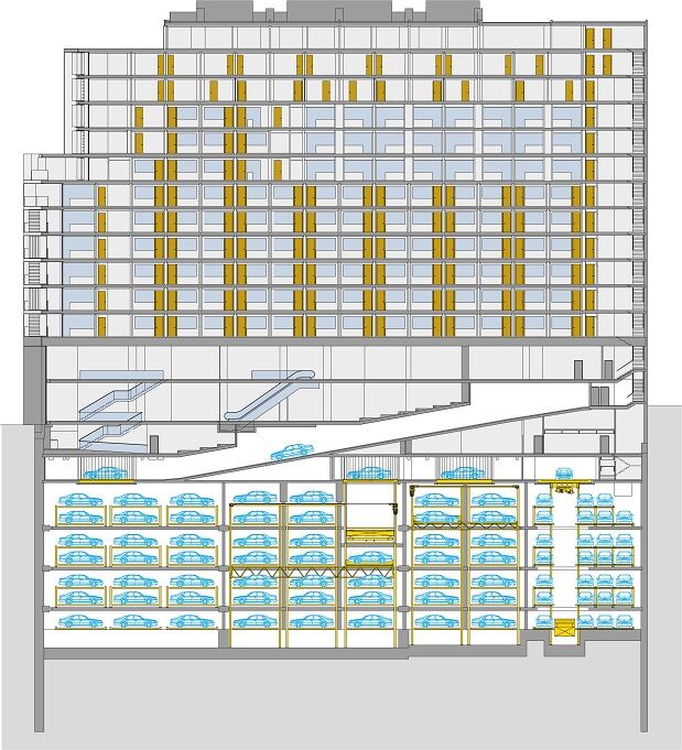 It is beside the Gran Via Capital boulevard in Madrid that the most innovative automatic car parking garage in Spain, featuring a WÖHR system providing a total of 320 parking spaces, has been located. In the long and very narrow construction volume, found unsuitable for planning conventional underground garage facilities, cars can now be driven up to one of the five, comfortable car transfer cabins via a cleverly designed car routing lane.