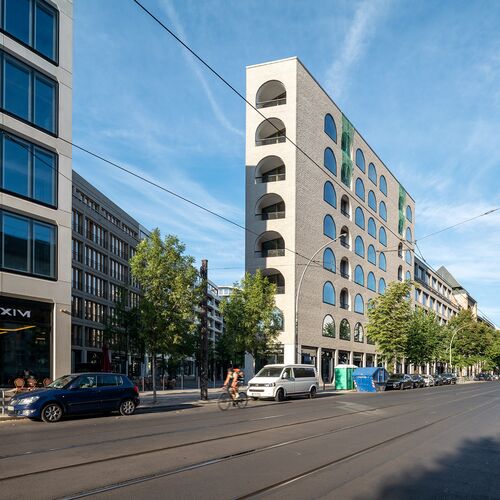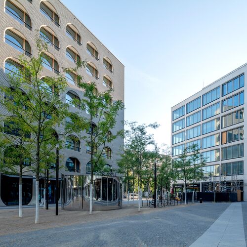 En comparación con muchos barrios de nueva construcción de Berlín, la plaza del nuevo barrio urbano de AM TACHELES tiene cualidades únicas gracias a su forma, apertura, diseño de las fachadas y vegetación. Como pequeño detalle, en el centro hay un cilindro con espejos que ofrece espacio para bicicletas.