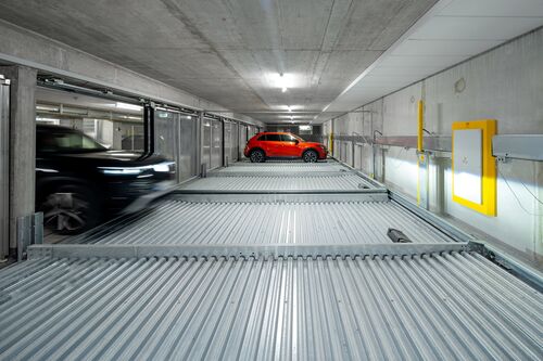La integración arquitectónica también desempeña un papel fundamental. El sistema de aparcamiento se integra armoniosamente en el diseño del barrio y convence por su aspecto moderno y homogéneo. El diseño compacto y la disposición de los sistemas de aparcamiento permiten ahorrar mucho espacio en el aparcamiento subterráneo. El espacio ahorrado se ha podido utilizar para otros fines arquitectónicos.