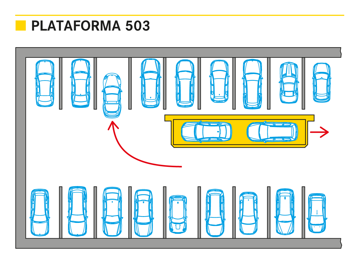 Plataformas con desplazamiento longitudinal que ofrecen la posibilidad de generar lugares de aparcamiento adicionales directamente en las zonas de circulación. Las plataformas se desplazan sobre rieles delante de las plazas de aparcamiento convencionales.