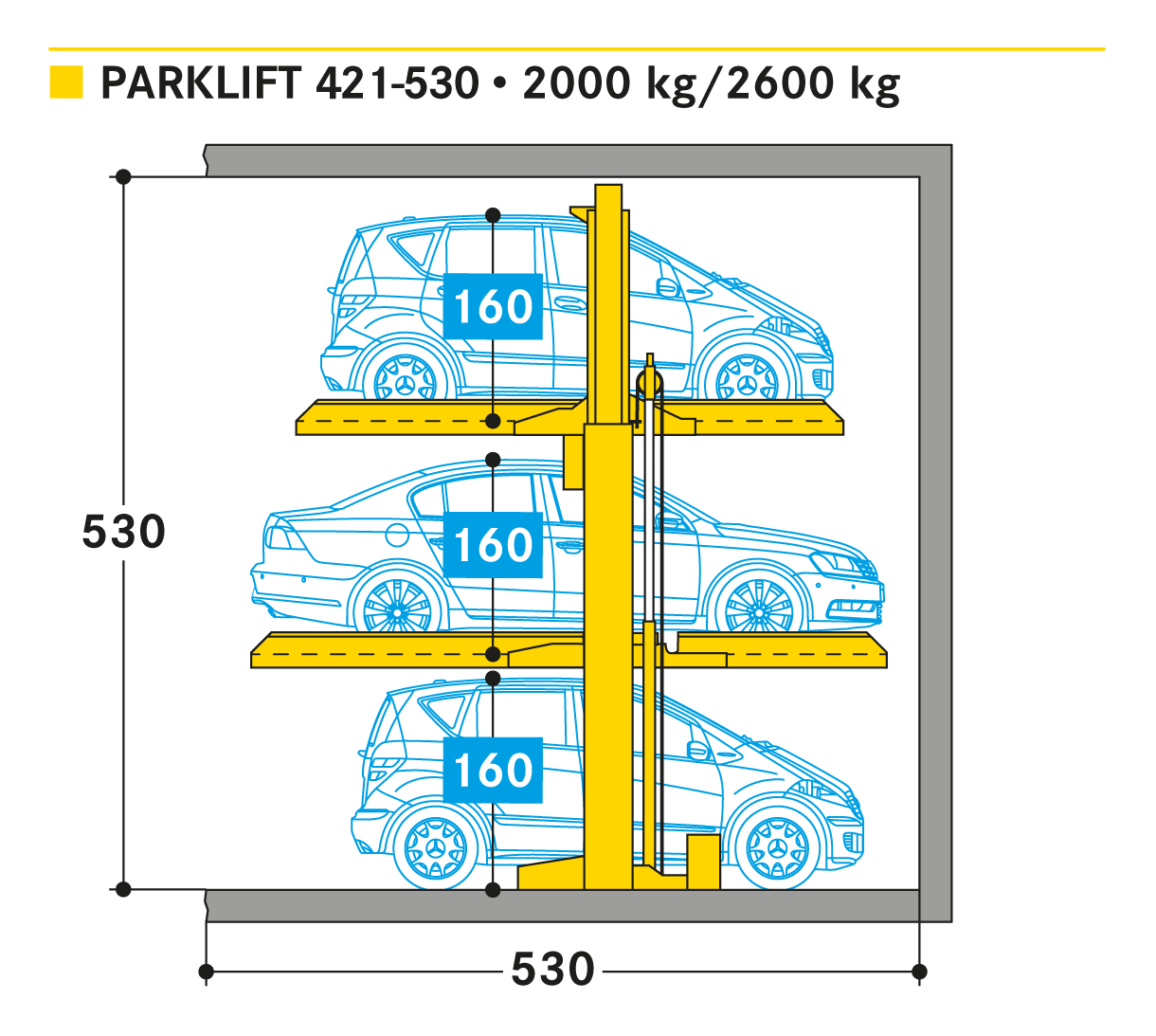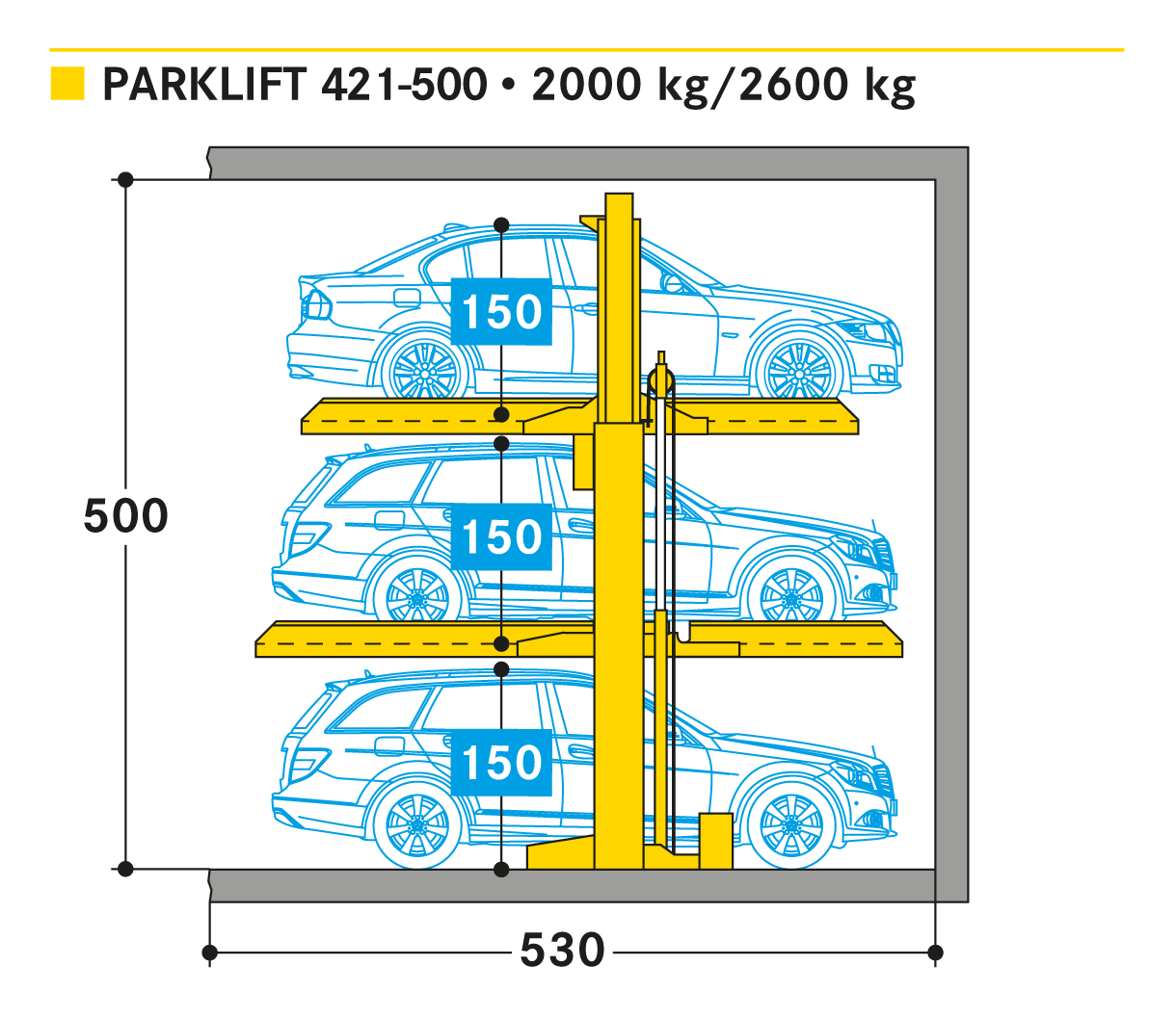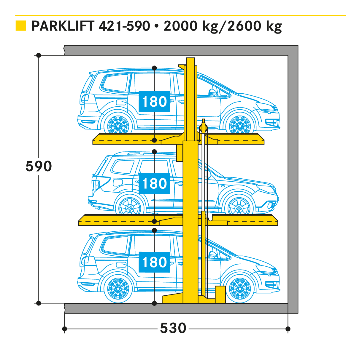 El Parklift 421 transforma una plaza de aparcamiento convencional en 3. Es una solución compacta siempre que se necesiten plazas adicionales de aparcamiento y los coches aparcados tengan espacio para maniobrar. El Parklift 421 tiene dos plataformas para estacionamiento dependiente entre usuarios. Primero se ocupa la plataforma superior, después la plataforma inferior y finalmente, una vez que ambas plataformas han sido elevadas, un tercer coche se puede estacionar sobre la losa de piso por debajo las plataformas. Para una gama más amplia de opciones, varios sistemas pueden instalarse uno al lado del otro o en filas uno detrás del otro o incluso al aire libre. Unidades sencillas para 3 coches.