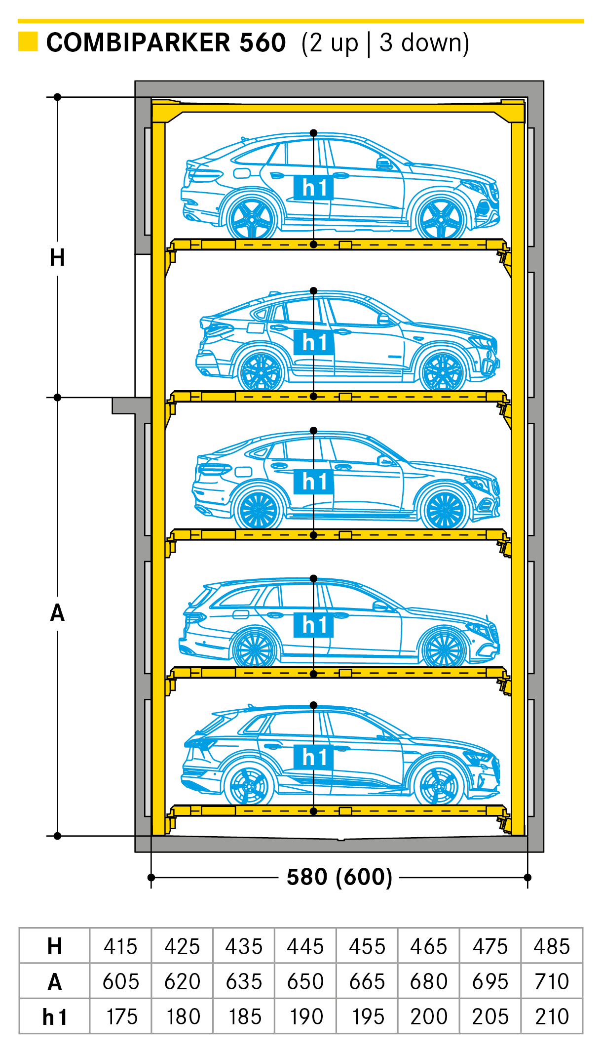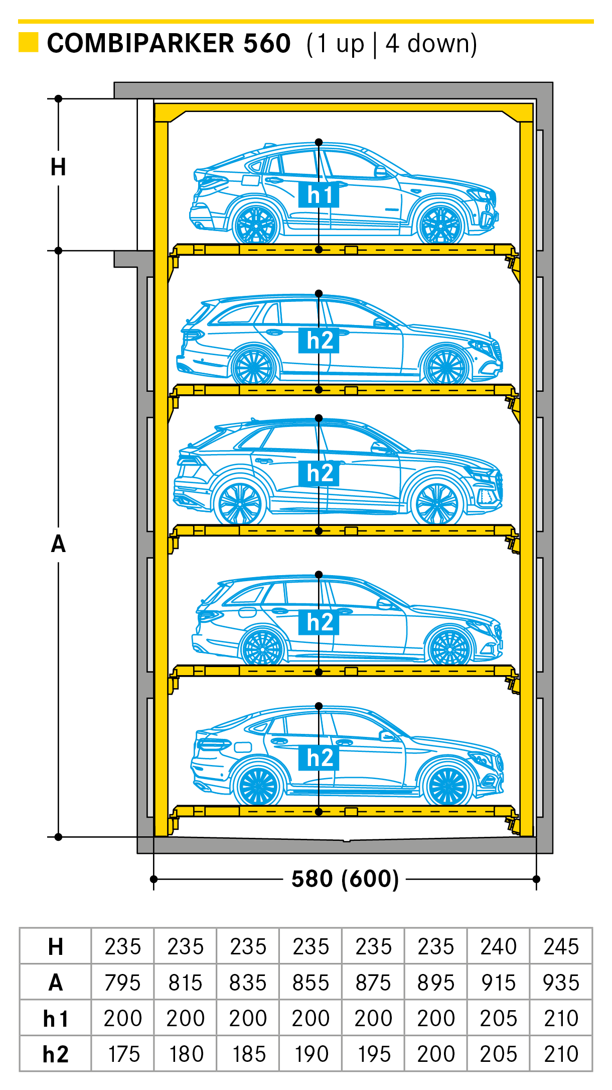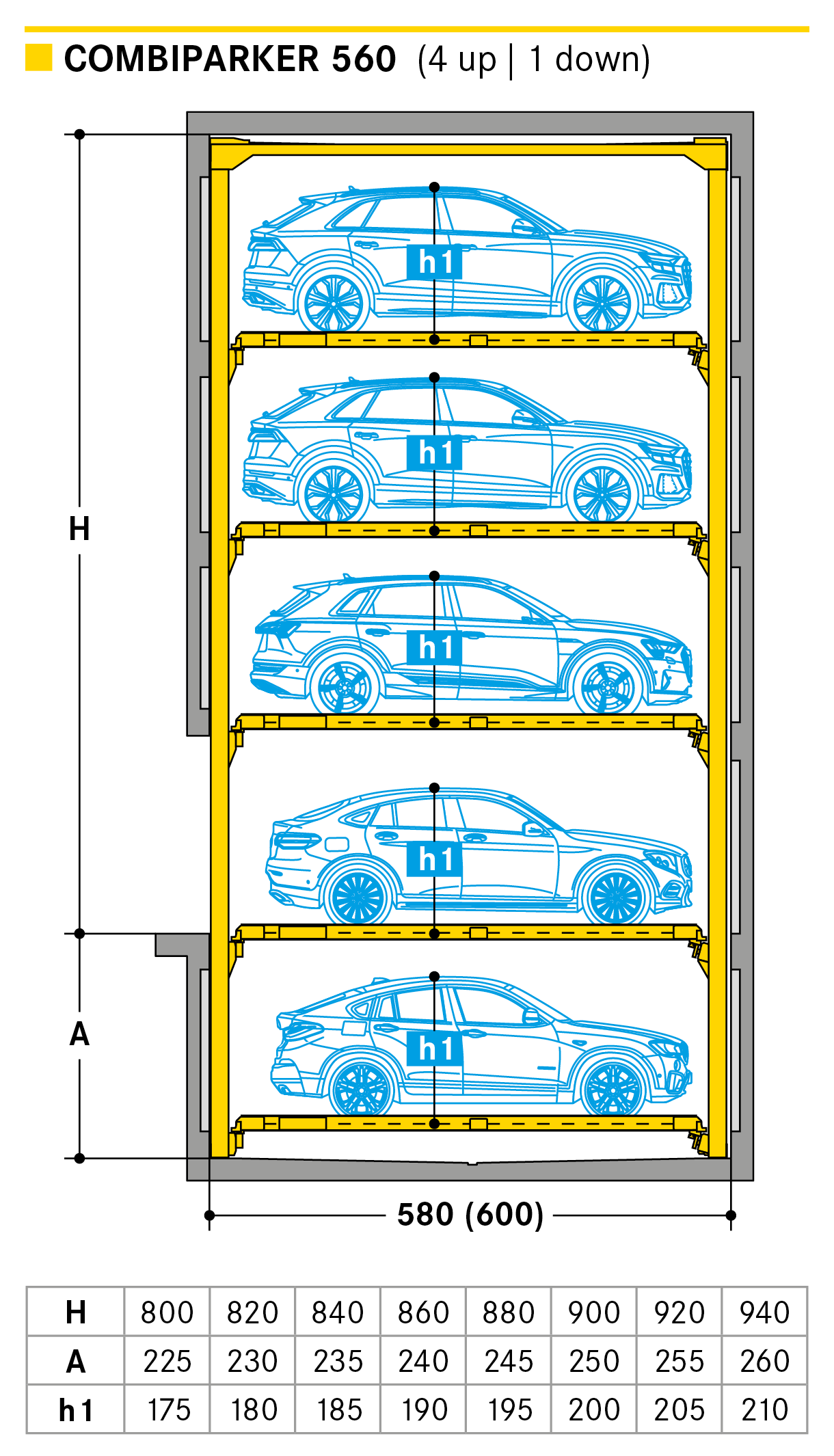Le Combiparker 560 offre jusqu’à 5 niveaux de stationnement qui peuvent être prévus en tant que 4 niveaux vers le haut ou 4 niveaux vers le bas à partir du niveau d’entrée. Ce qui rend le nouveau Combiparker 560 si particulier est qu’il est possible d’y rattacher jusqu’à 4 niveaux en dessous avec une hauteur normale d’étage de garage souterrain de 2,50 m.
