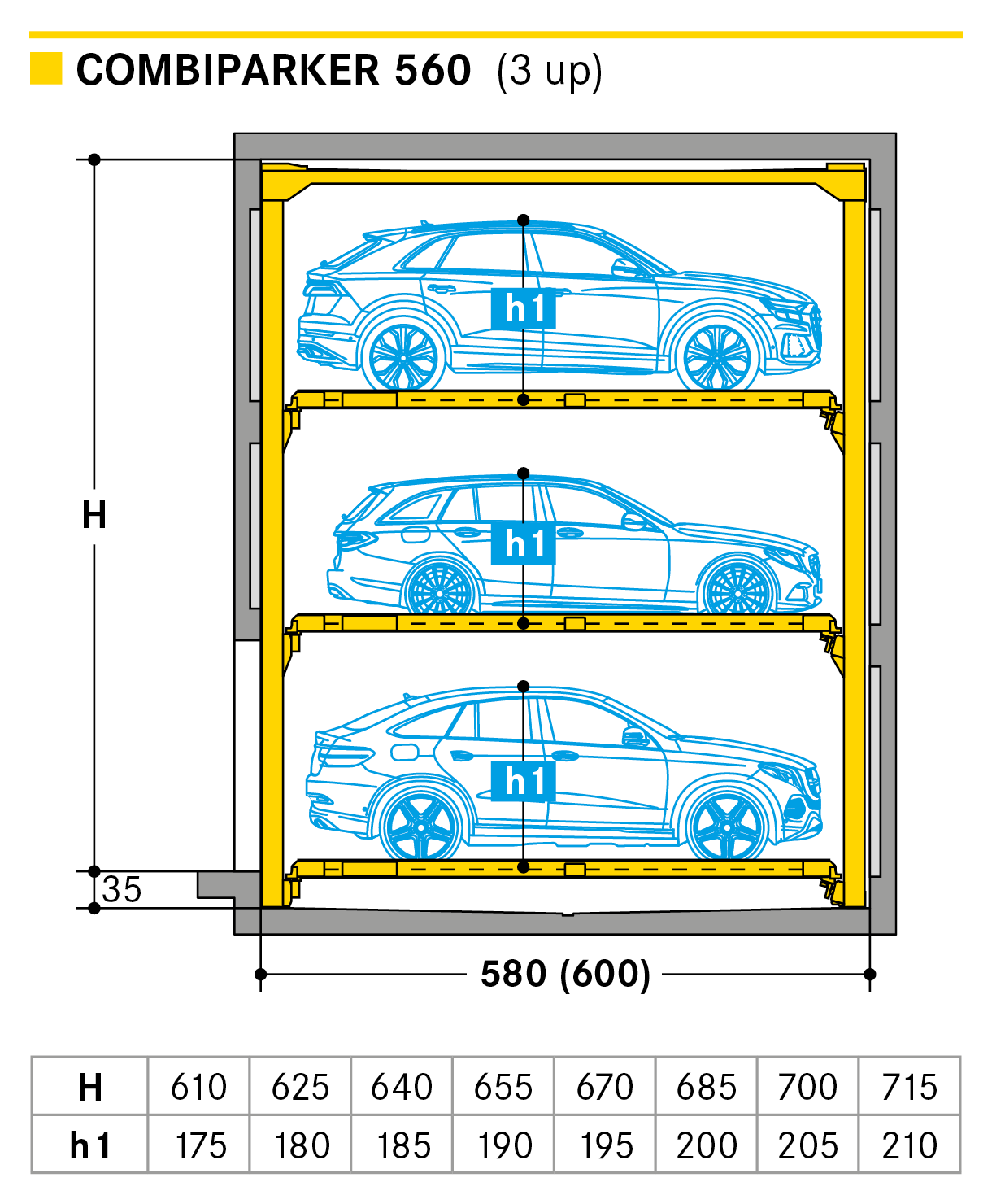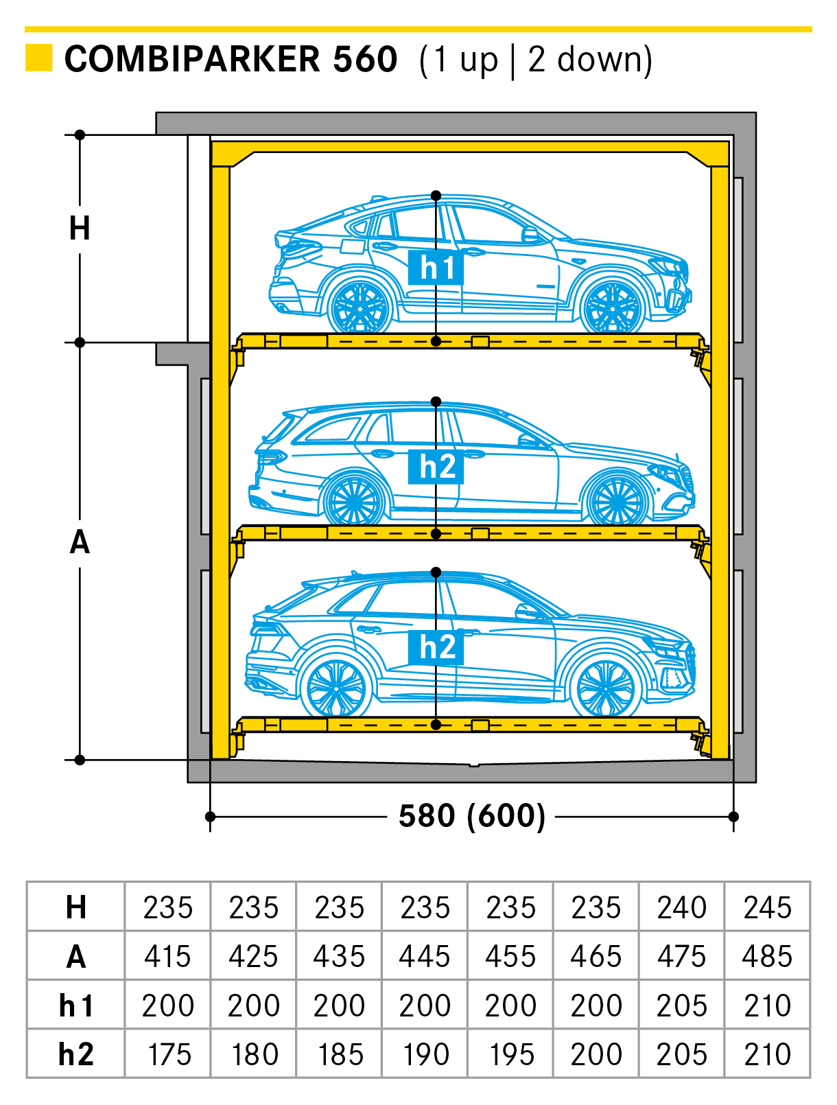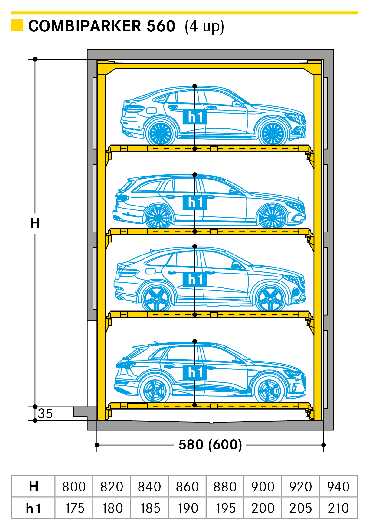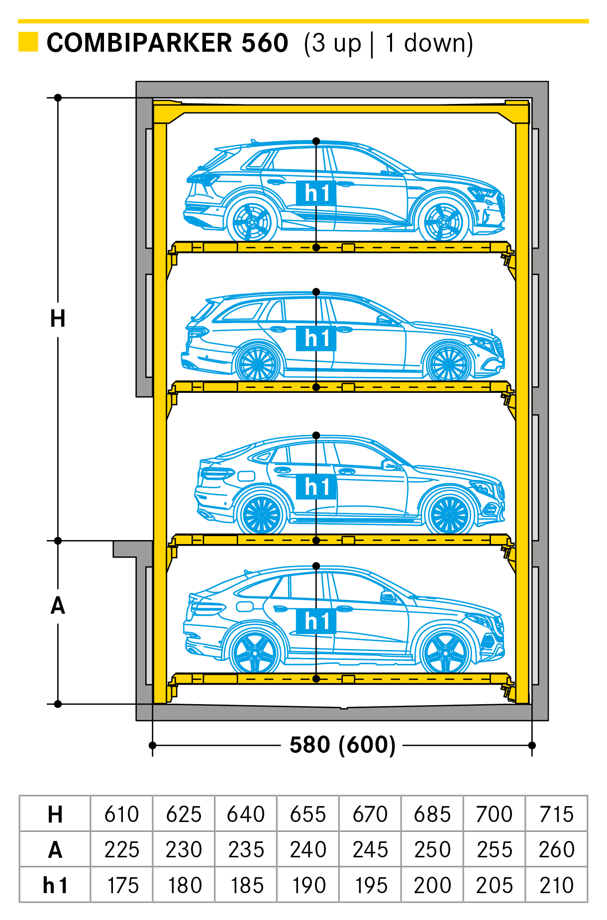 Le Combiparker 560 offre jusqu’à 5 niveaux de stationnement qui peuvent être prévus en tant que 4 niveaux vers le haut ou 4 niveaux vers le bas à partir du niveau d’entrée. Ce qui rend le nouveau Combiparker 560 si particulier est qu’il est possible d’y rattacher jusqu’à 4 niveaux en dessous avec une hauteur normale d’étage de garage souterrain de 2,50 m.
