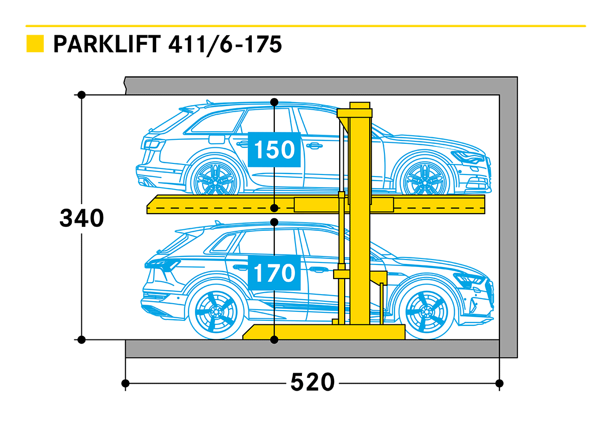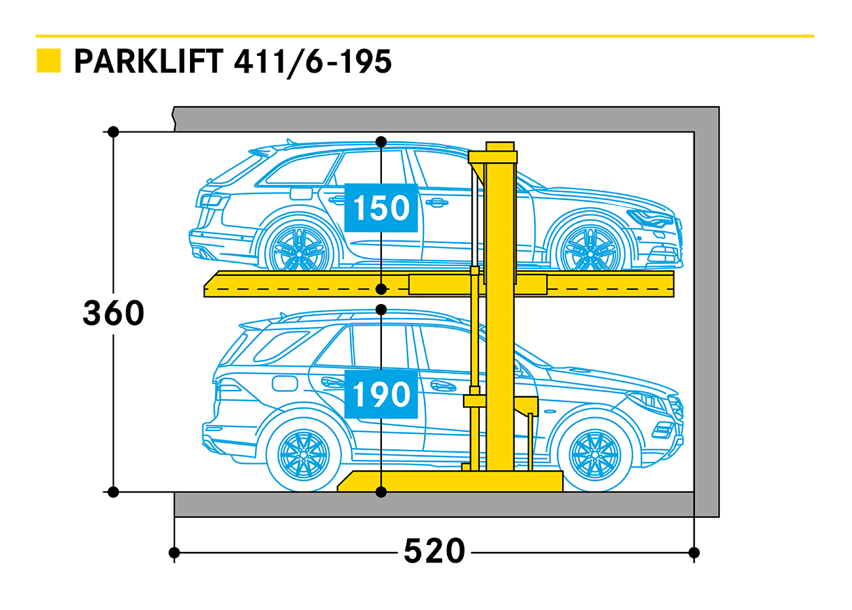 Dépendant signifie que la place inférieure doit être libérée pour permettre l'utilisation de la place supérieure. Avec un petit équipement supplémentaire, le Parklift 411 peut aussi être installé en extérieur. L'installation simple est conçue pour 2 véhicules.