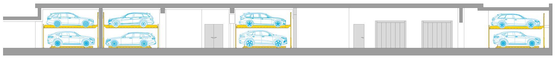 Au sous-sol, un parking souterrain commun de près de 100 places a été construit, accessible par deux ascenseurs pour voitures. 50 places de stationnement sont disposées de manière peu encombrante dans quatre systèmes semi-automatiques WÖHR Combilift 551. Des espaces sont également disponibles pour le covoiturage. La réduction du nombre de places de stationnement à 0,4 par unité d'habitation et l'utilisation des systèmes compacts WÖHR soutiennent la stratégie de mobilité durable du quartier et contribuent à la réduction des coûts de construction.