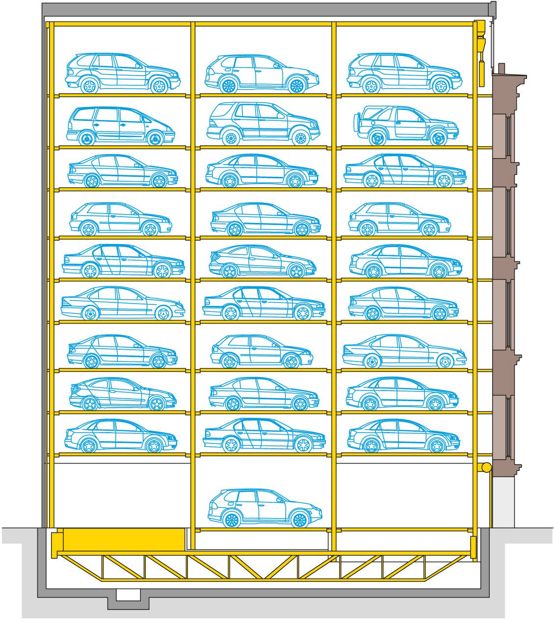 La tour de parking auto-porteuse à ossature métallique soutient le mur de la façade classée monument historique, du côté de la rue et de la sortie. 84 places de stationnement sont dissimulées derrière, pour les appartements et les bureaux réhabilités dans le bâtiment «Albany» construit à l'origine en 1858, dans le quartier des banques, non loin du port. Derrière la façade, les voitures sont garées automatiquement dans l'ossature métallique, sur des palettes réparties sur trois trames les unes derrière les autres et 10 niveaux superposés. En toute sécurité, comme dans un coffre-fort, 84 places de stationnement ont été logées rationnellement entre les bâtiments, dans une niche d'environ 10 m de large et 18 m de long. L'animation montre le fonctionnement du système.